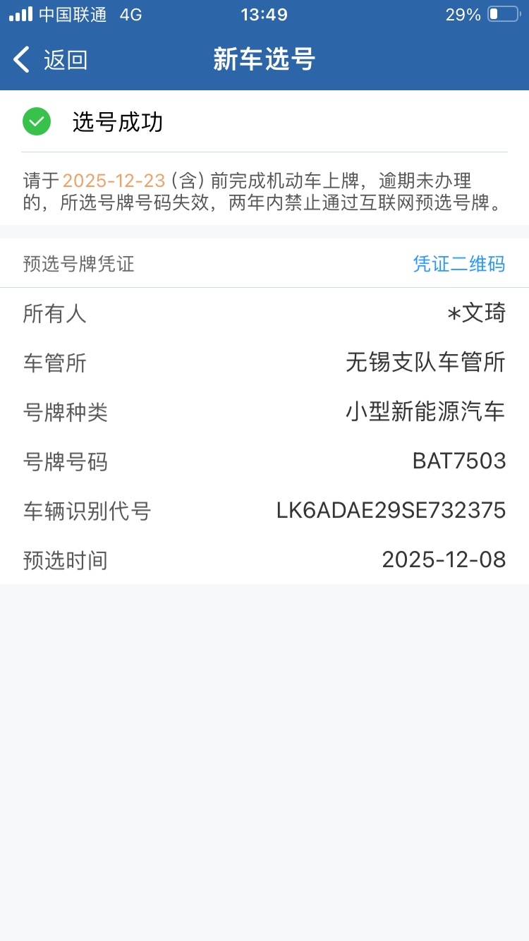 一早被电话叫醒,供电局打电话来说一会过来看现场,之前我提出充电桩安装点换到旁边10米出的一个地方,今天他们来再次现场勘查,最后确认了还是只能安装原来位置,并且楼下几个老太太平时晒被子的晾衣绳被他们勒令拆掉,不安全。 4s店说车已经在门店了,于是我要求今天下午提车,本来计划是明天提车,销售问不是说好了明天嘛,我说今天日子吉利。 午饭后打车去了店里,验车,车管所上牌,选号,使用操作说明,售后告知一些售后政策,一通下来3点半了,这一切都算顺利没怎么浪费时间,我还给他们办公室几个人发了哥从德国万圣节带回来的糖,给那个销售单独一个小礼包,护手霜,润喉糖,蓝罐atrix护肤霜,封一个袋子里塞给她,她又帮我给领导出了首保免费外,再申请了两次免费保养,赚了。 车牌号选了苏BAT7503,要不是后面只能是数字,我会直接选BATMAN。回来后开到家小区半条街,车停好,拍几张照,家里拿了血压计,又去父亲那里,给他测一下血压,顺便把血压计放那里。
